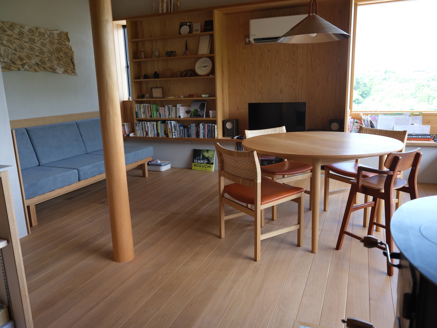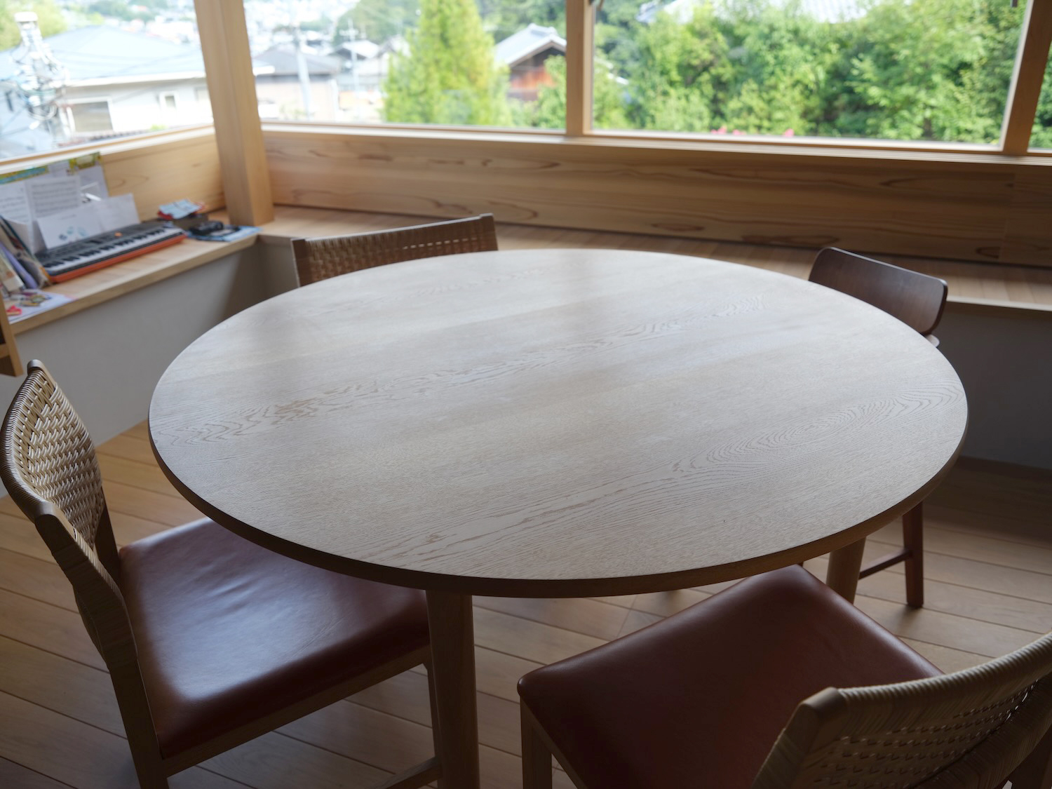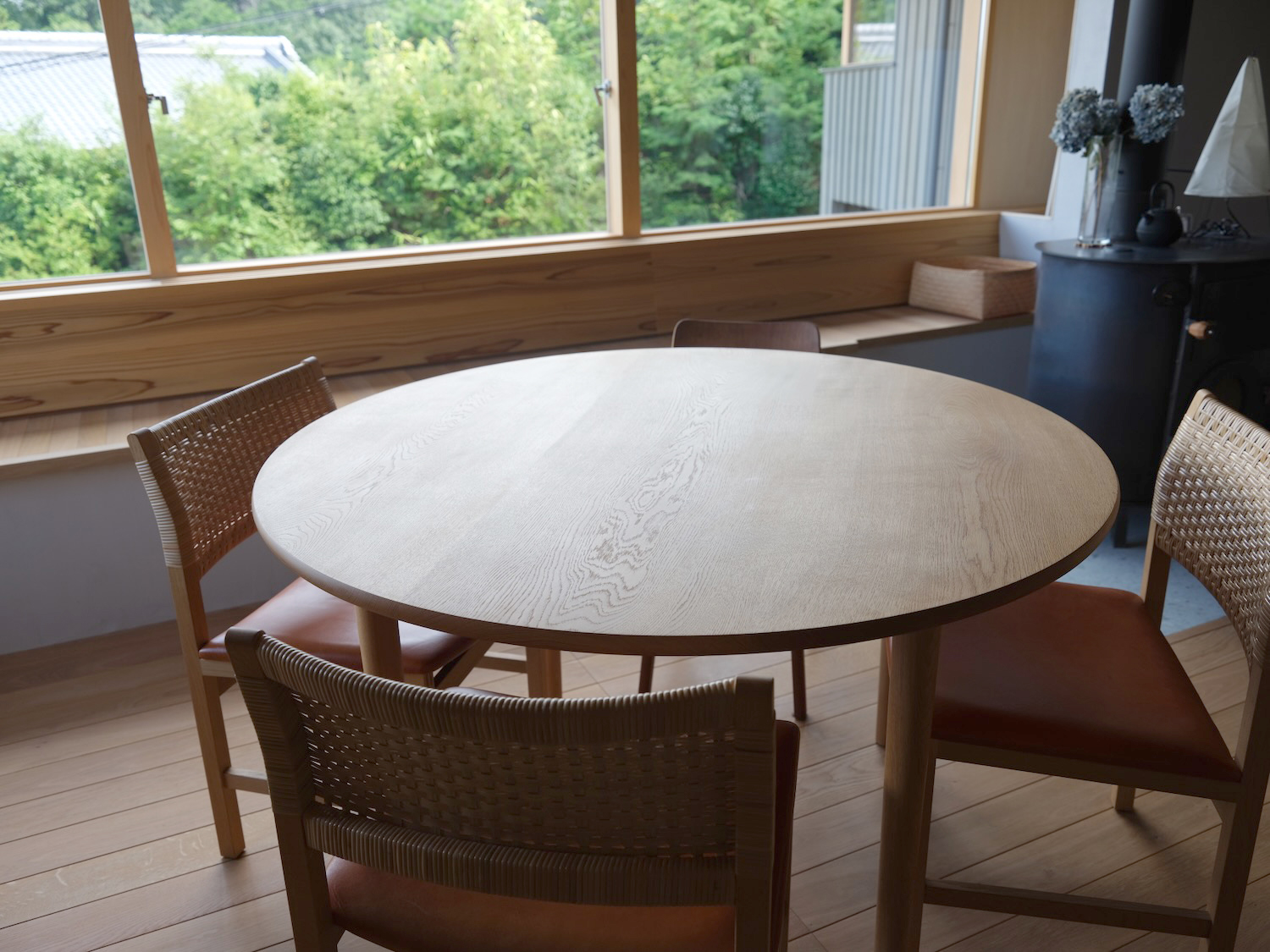 φ1200mmの円卓と皮籐編みの背もたれのダイニングチェアです。