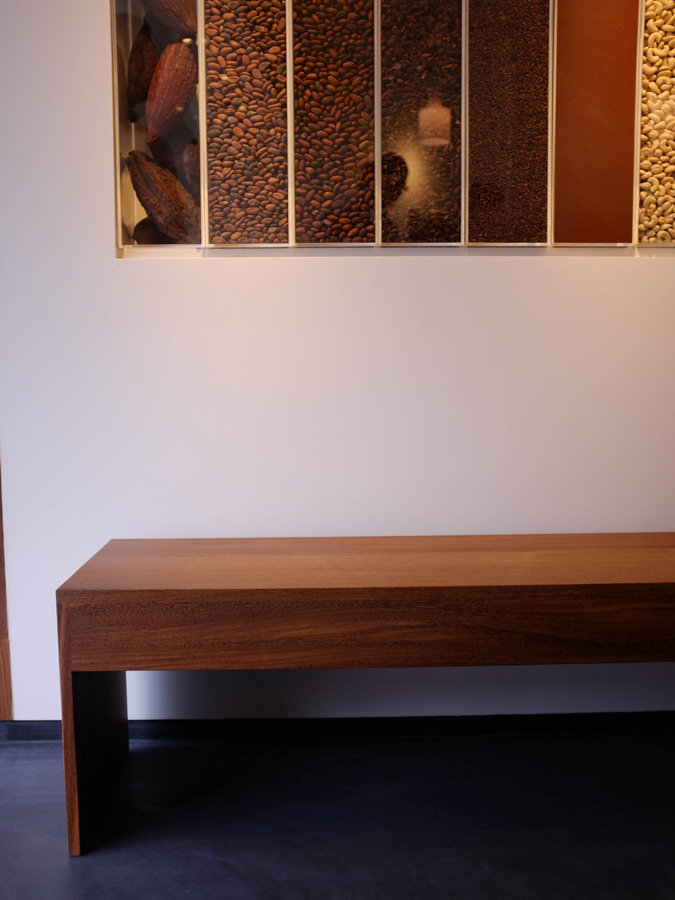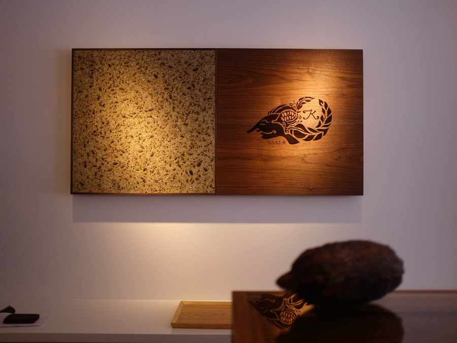 右側のサインパネルと、カカオニブ入りの左官パネル。