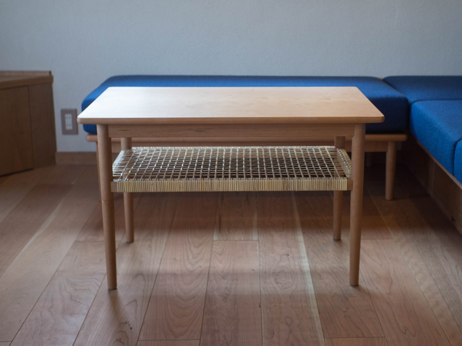 藤編みの棚がついたコーヒーテーブル。